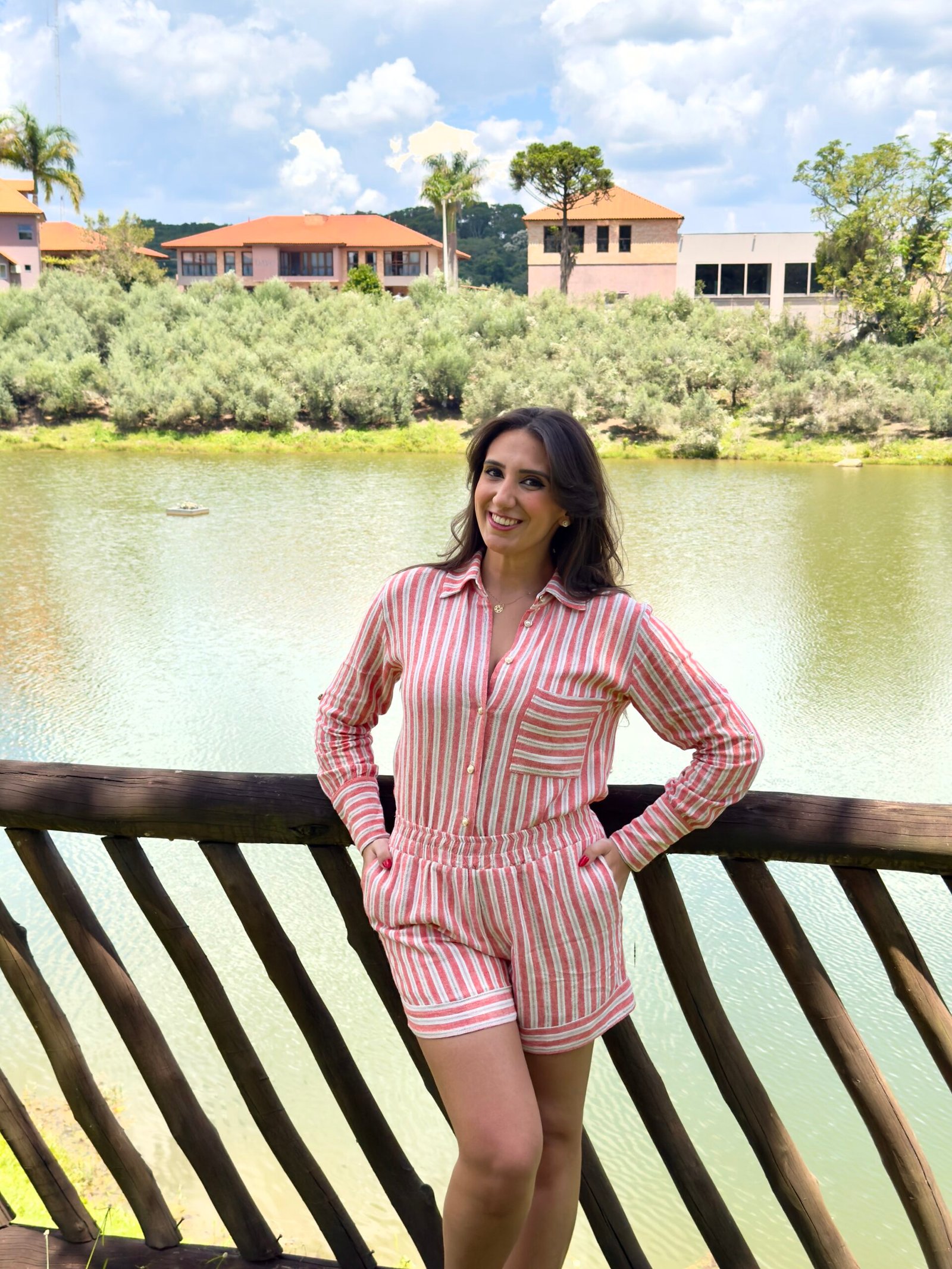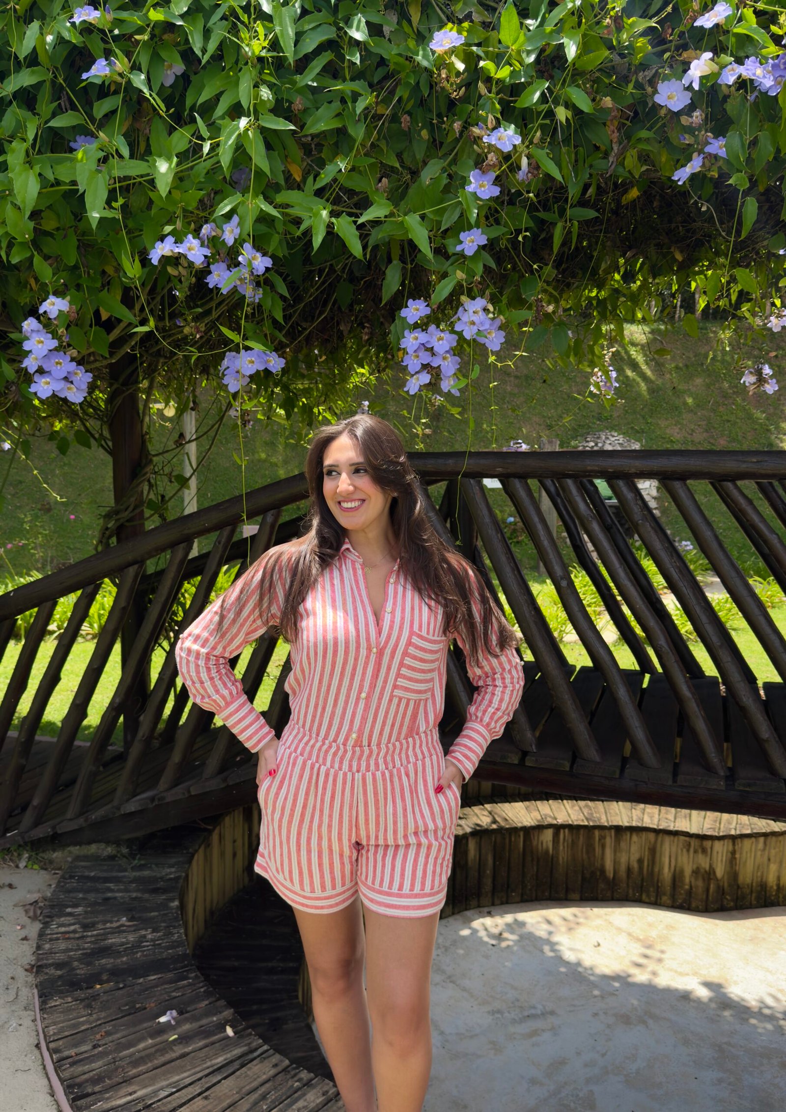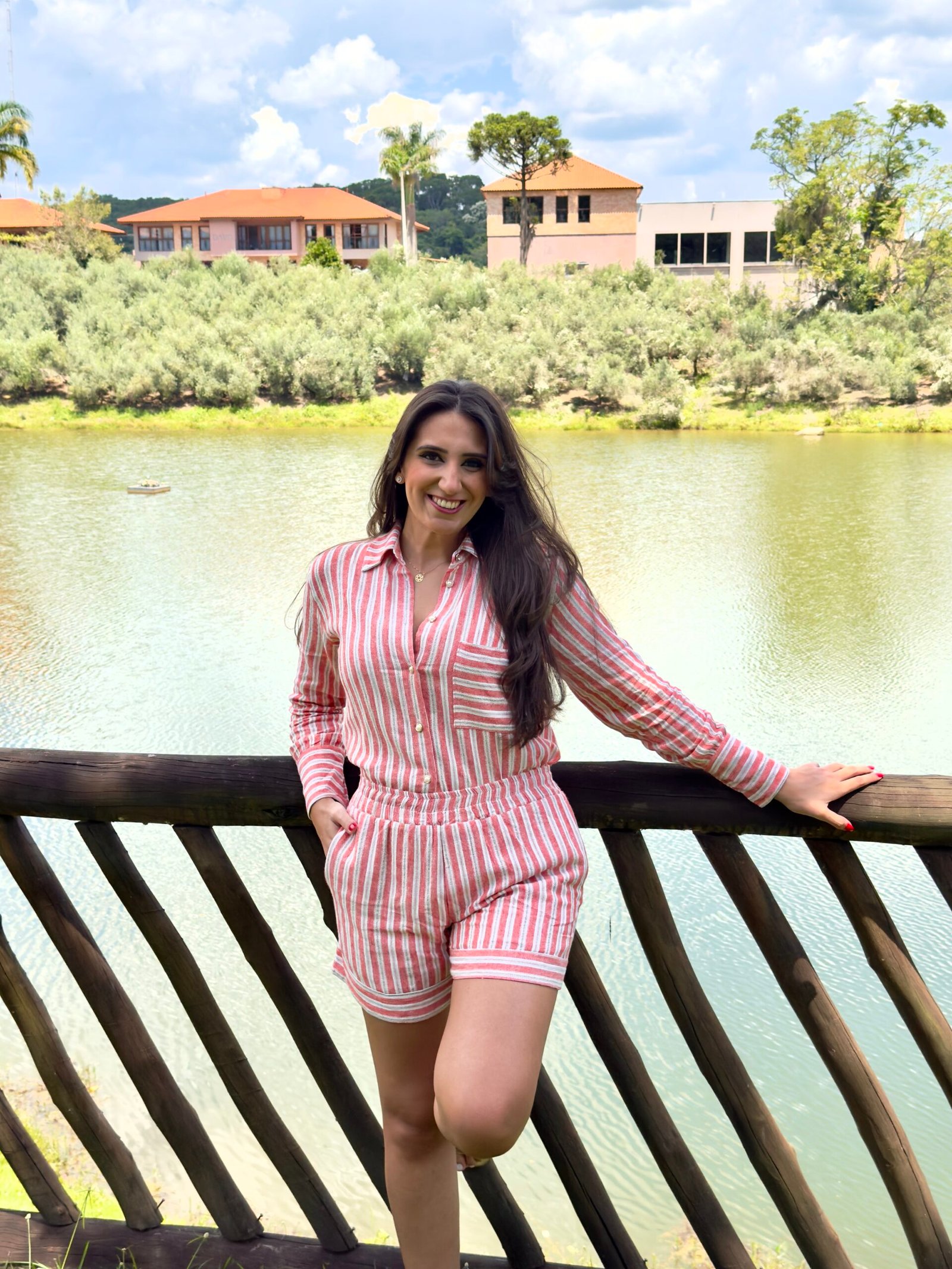 Conjunto em tecido leve com estampa listrada, composto por camisa de manga longa com botões frontais e bolso, e shorts de cintura alta com caimento confortável.