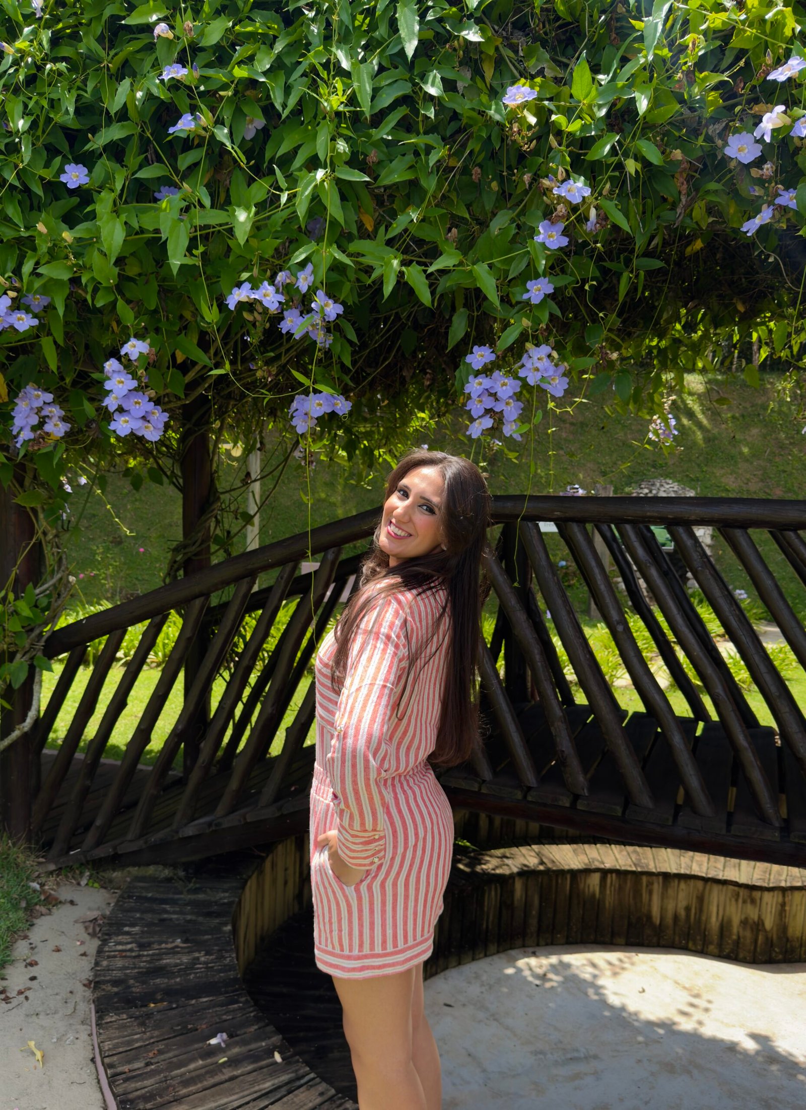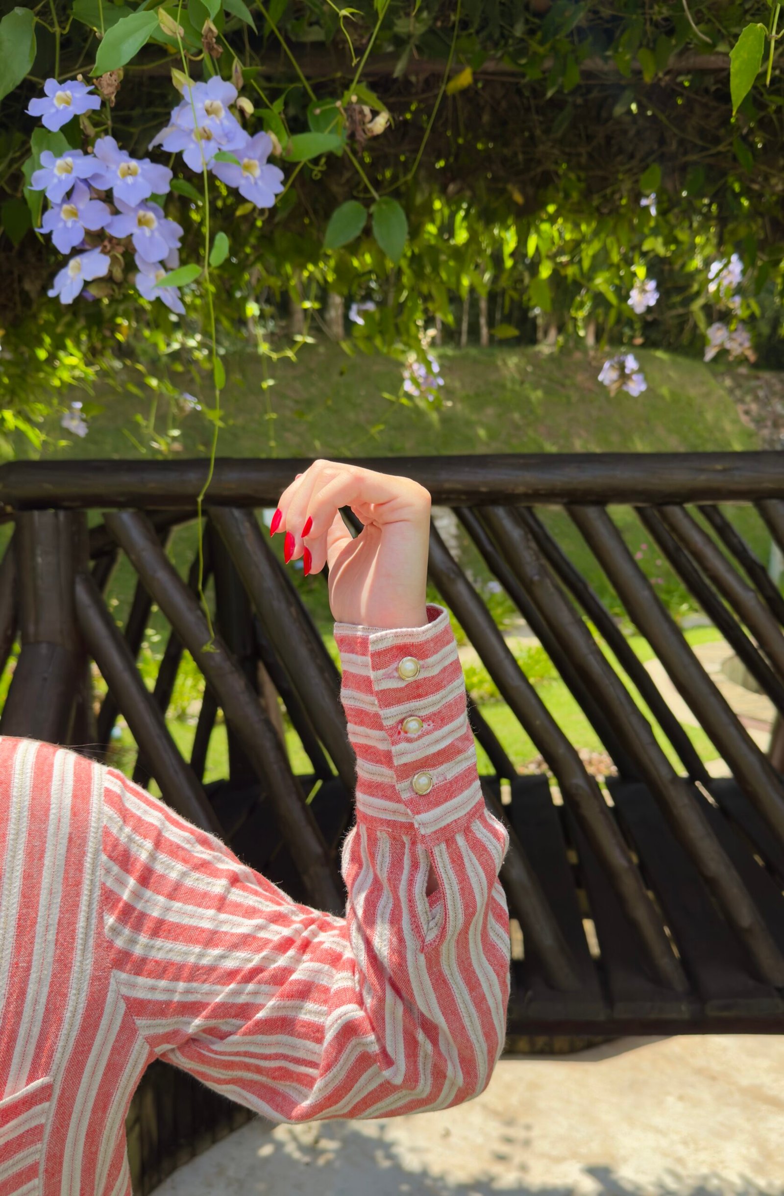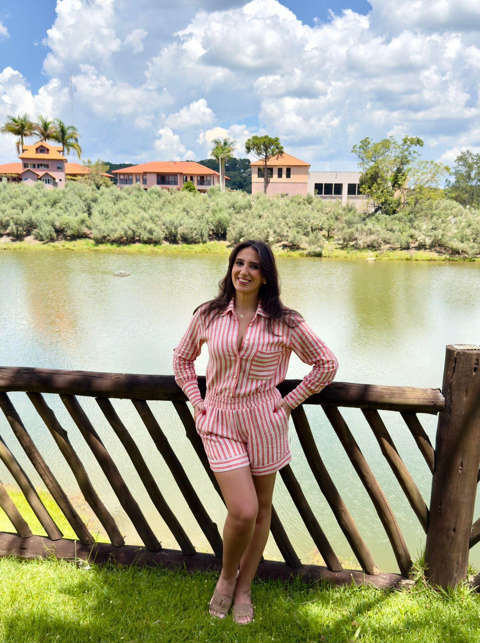 Conjunto em tecido leve com estampa listrada, composto por camisa de manga longa com botões frontais e bolso, e shorts de cintura alta com caimento confortável.